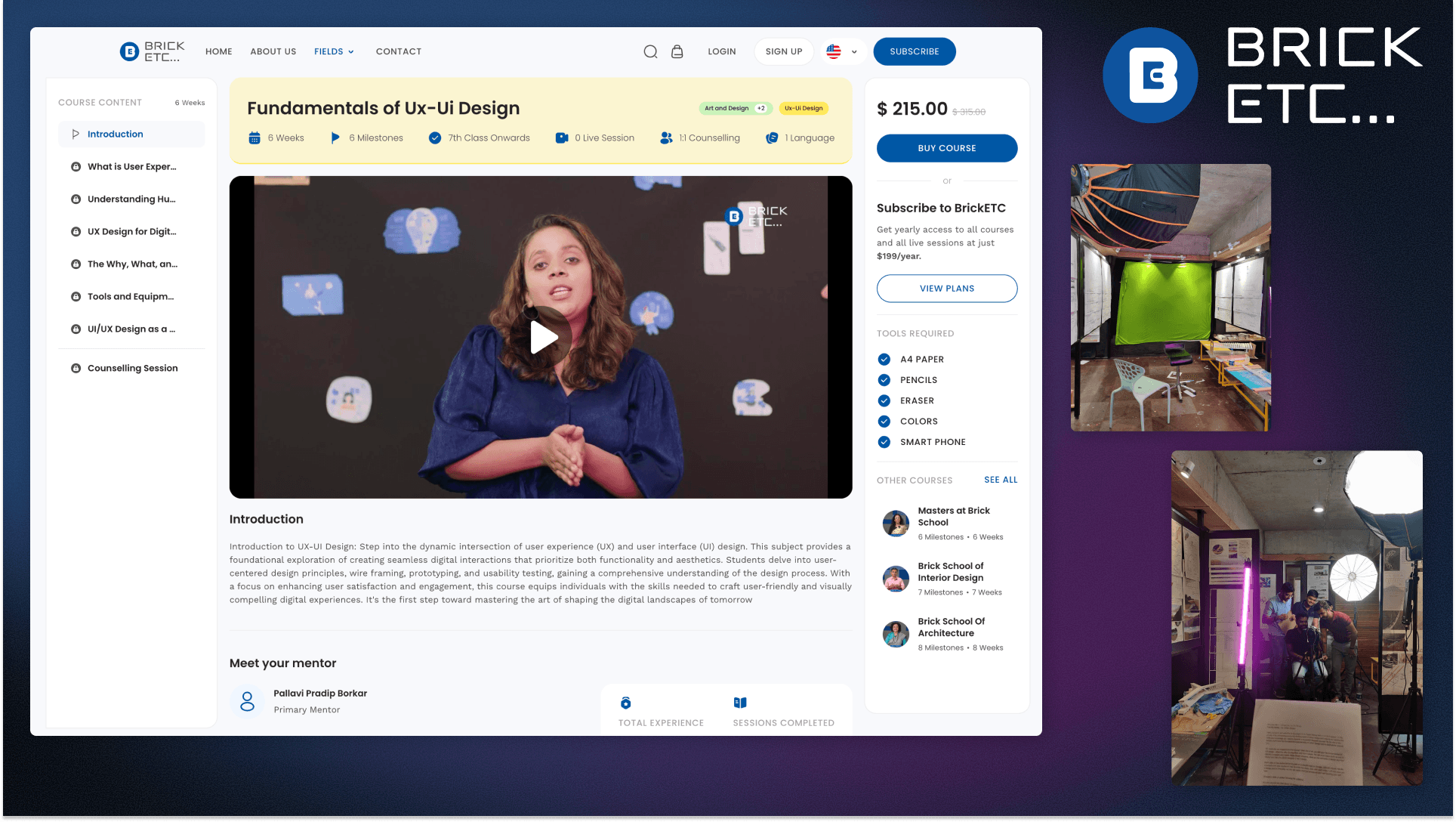 The outcome of this work was a curated UX primer hosted on Brick ETC, delivered through recorded sessions designed for self-paced exploration. The curriculum introduces learners to the scope of UX design, its practice in real-world settings, and the range of roles within the field.