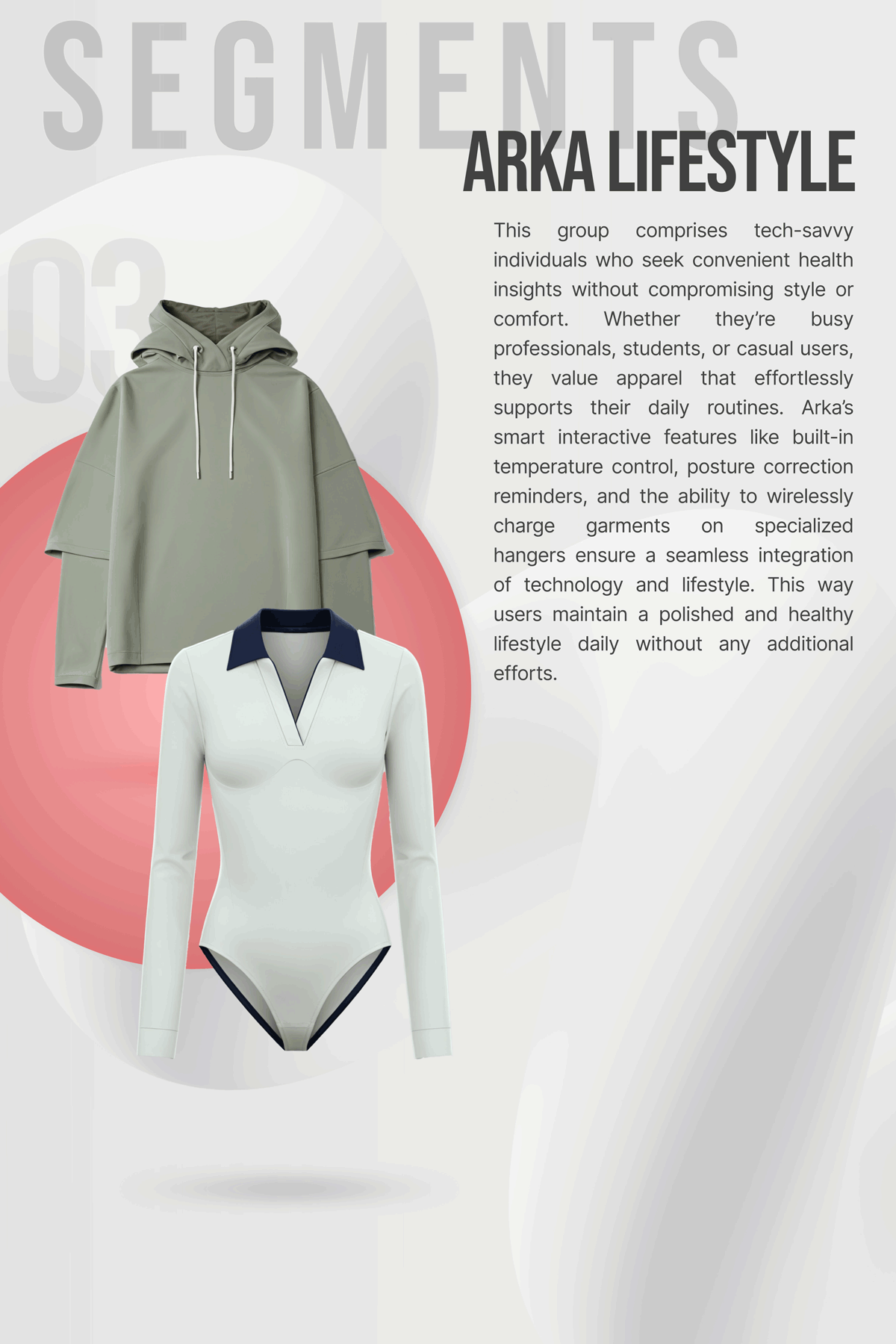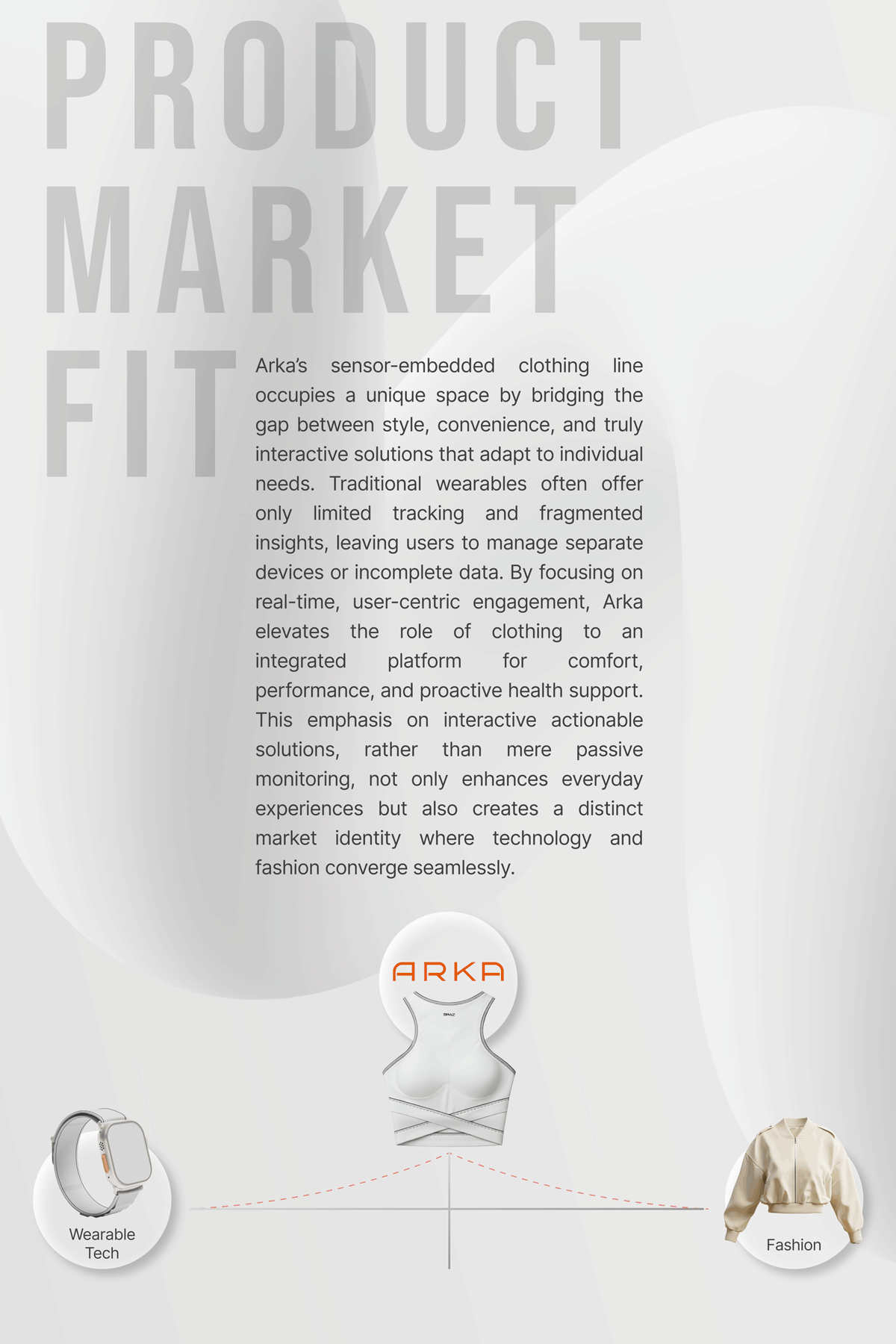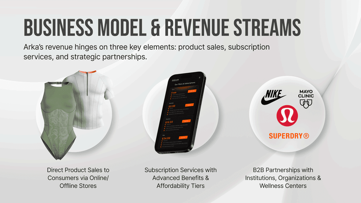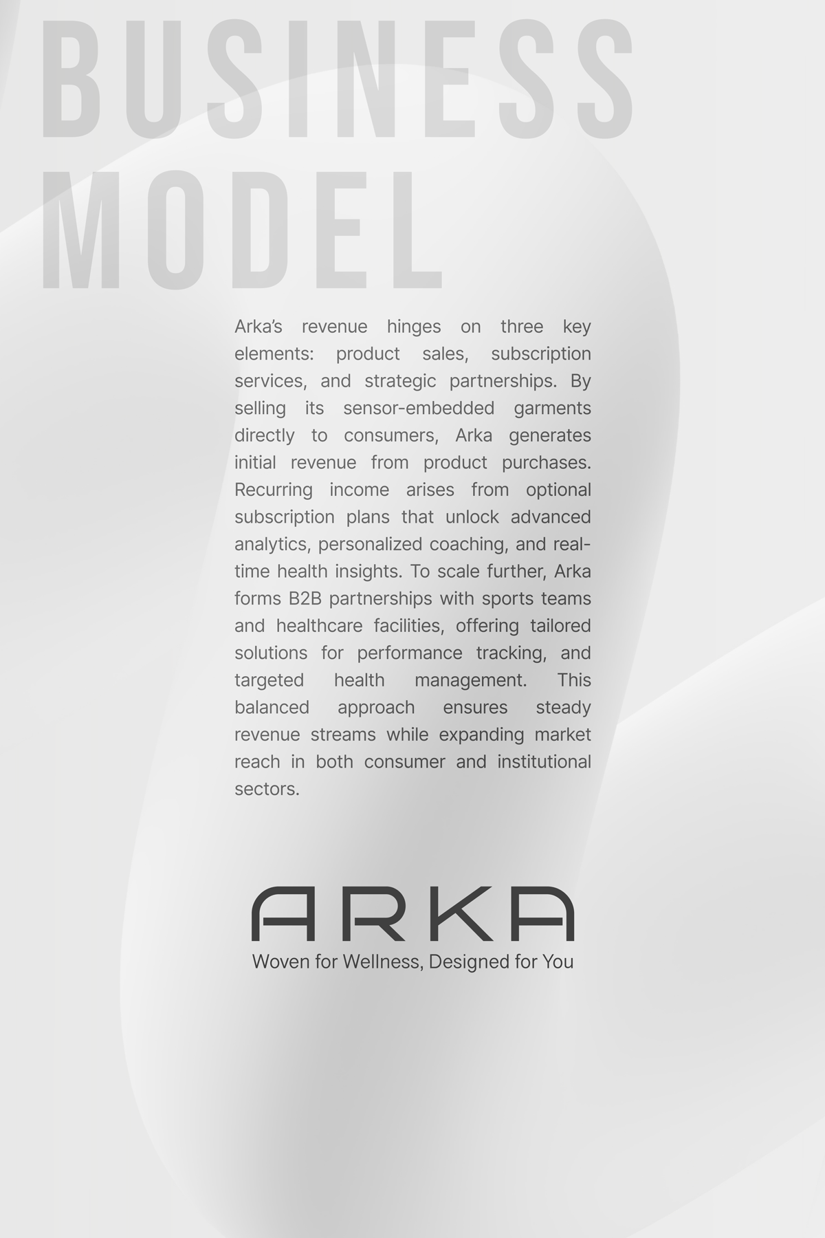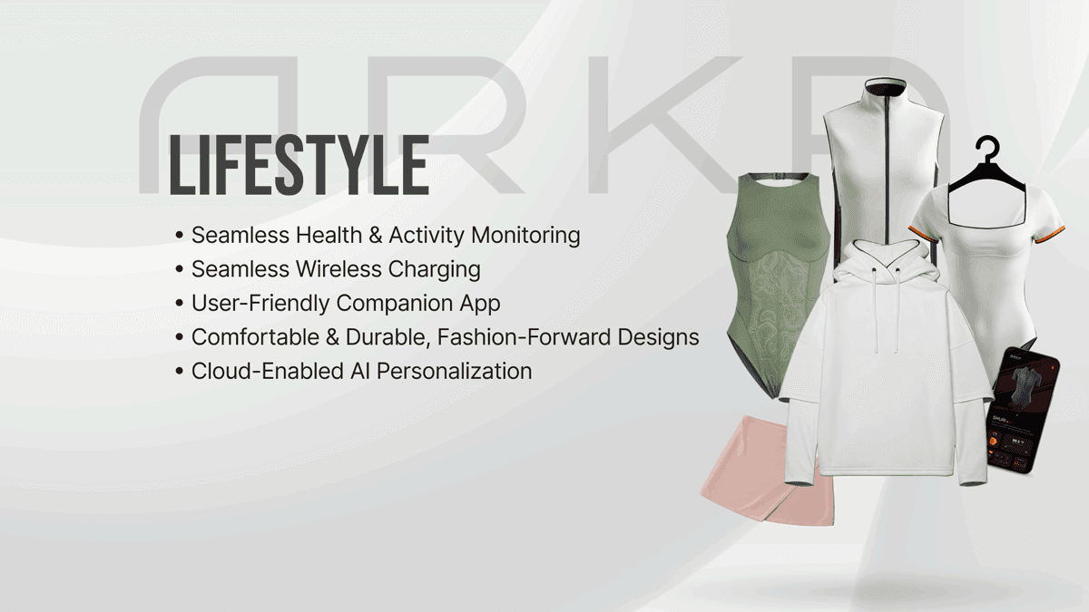 ARKA is a smart clothing platform that integrates health monitoring into everyday apparel, offering personalized, continuous support that fits seamlessly into daily life.