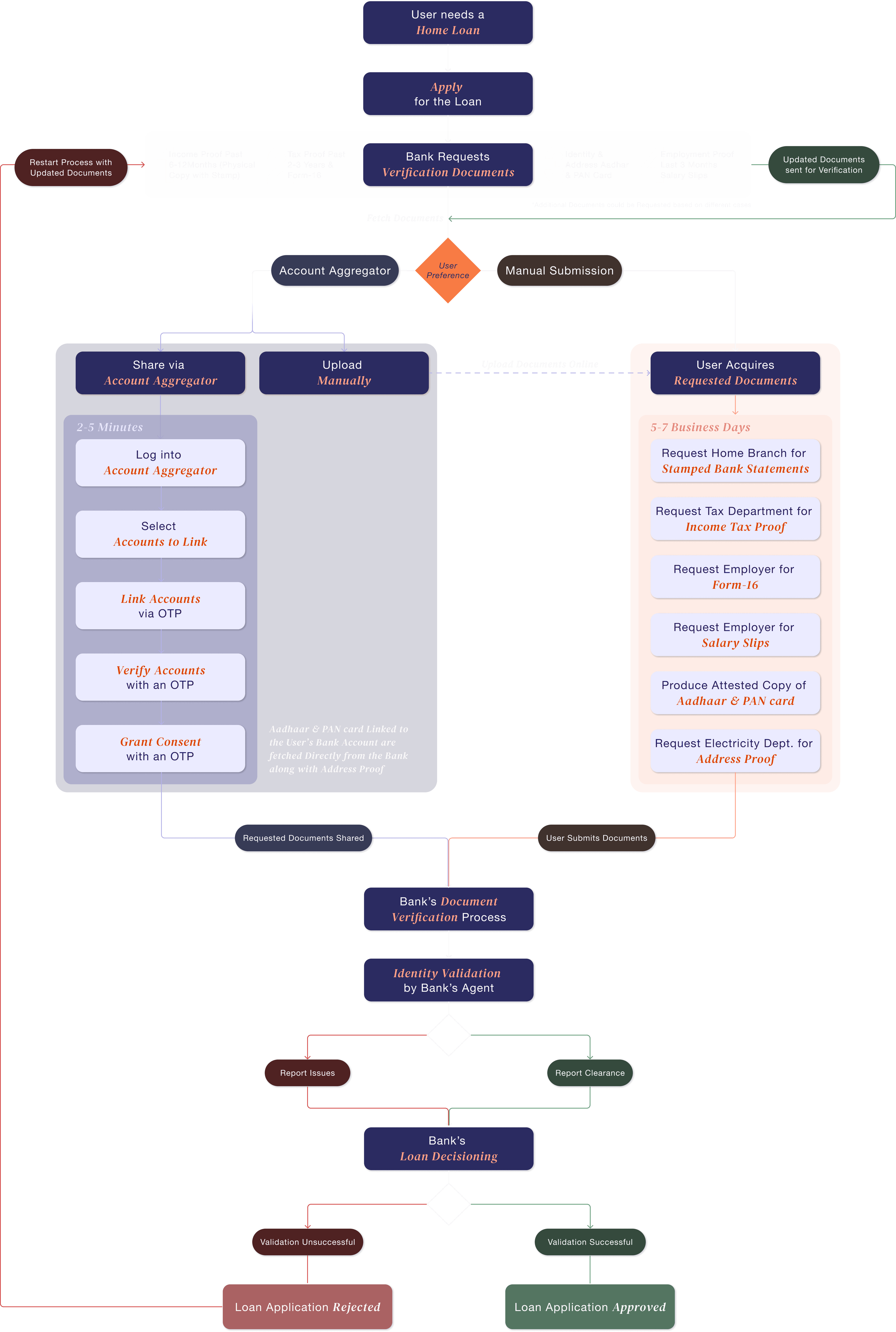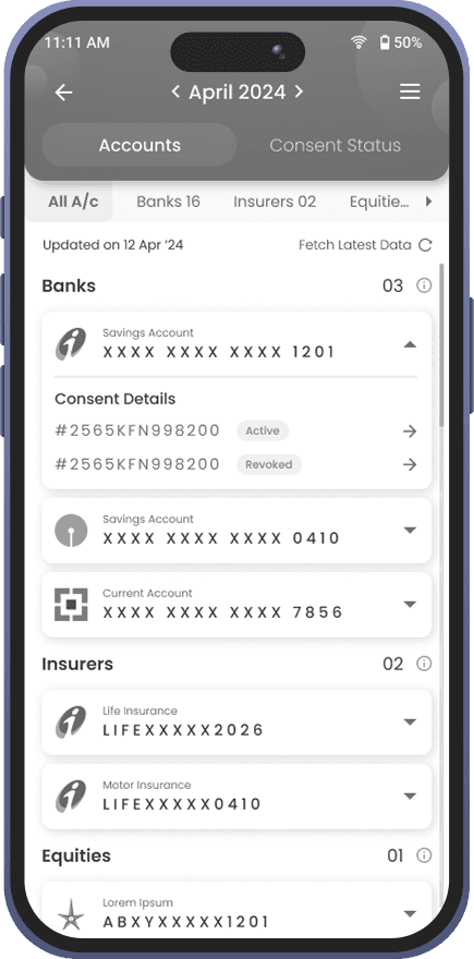 The Account Aggregator (AA) is a digital framework that enables secure, consent-based sharing of financial data between institutions. I designed the end-to-end experience, covering the consumer-facing consent flows, the provider-facing management consoles, and the governing design standards.