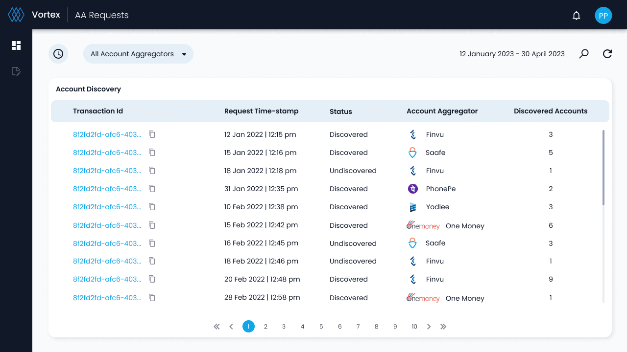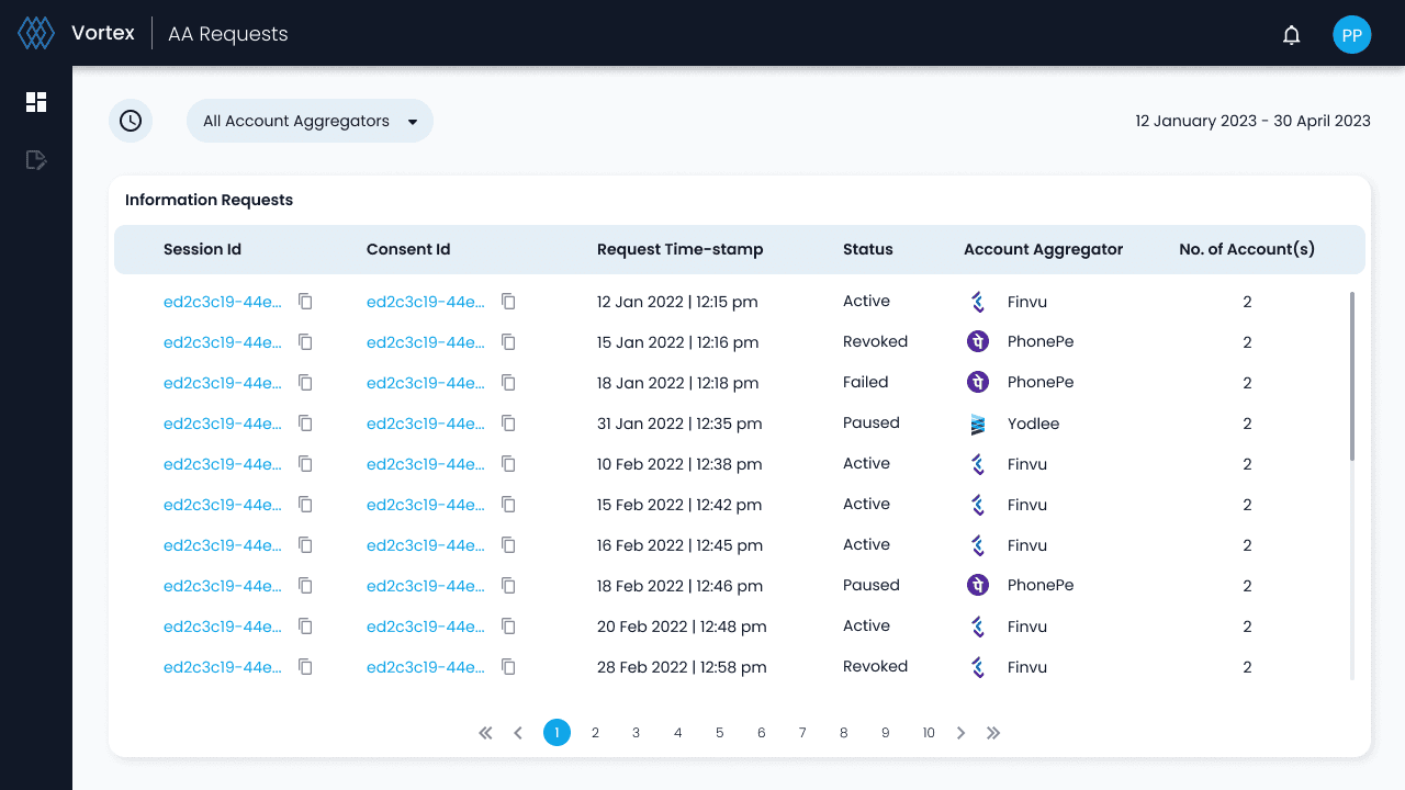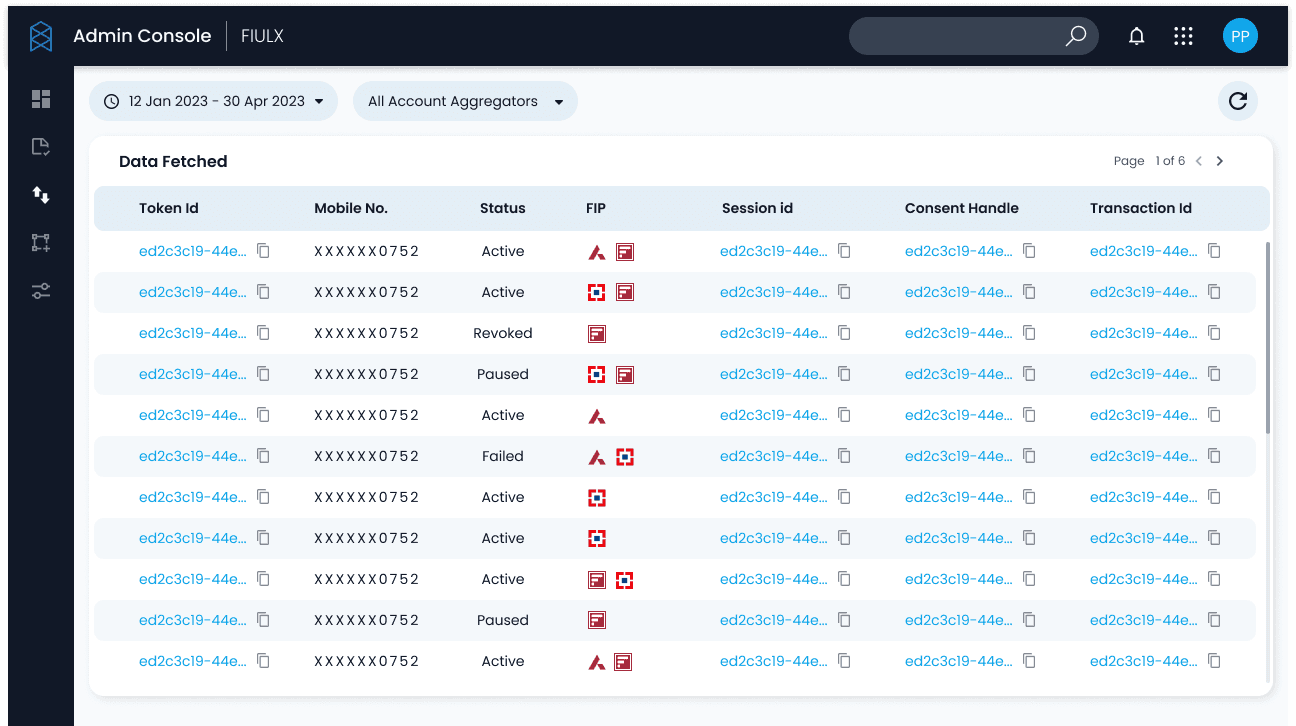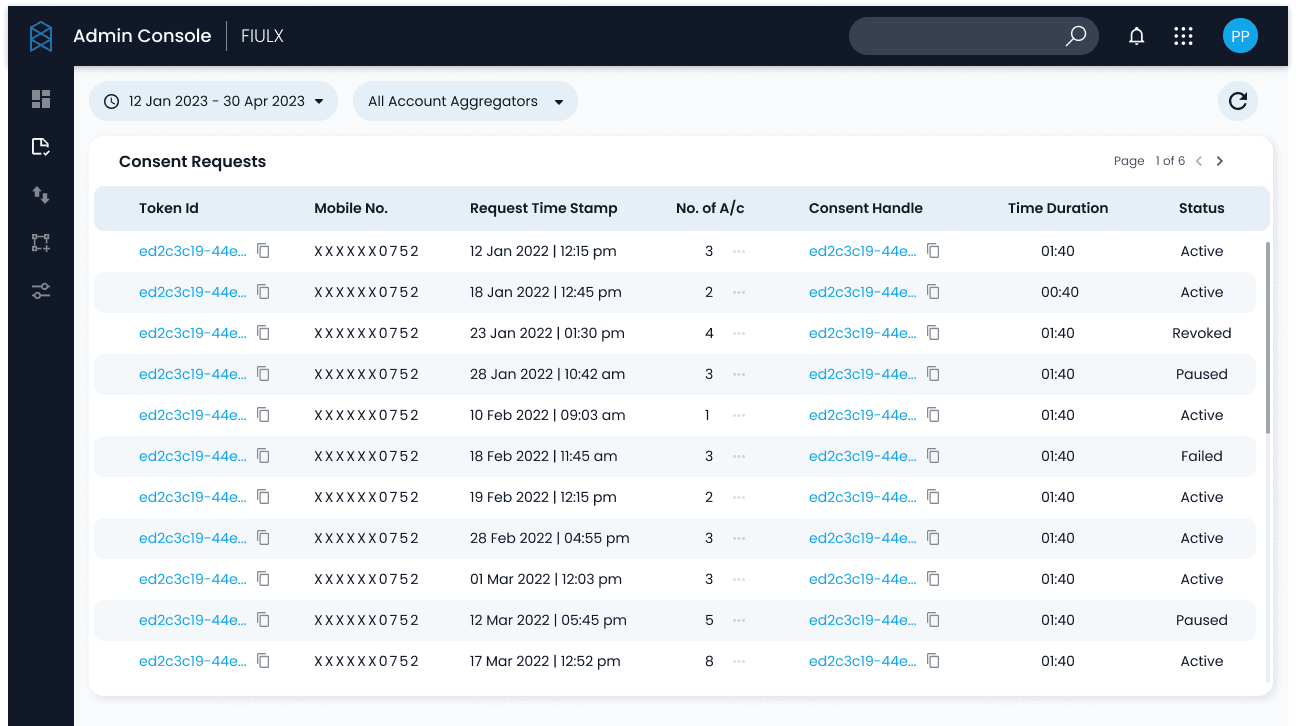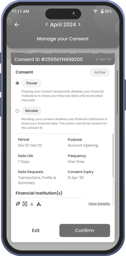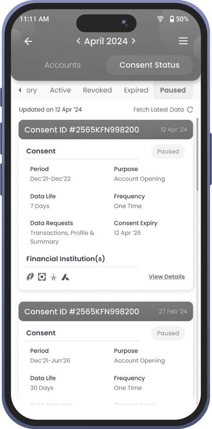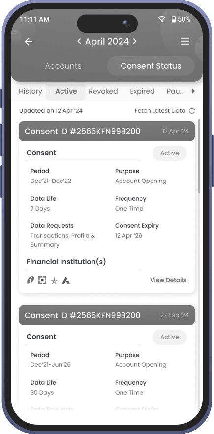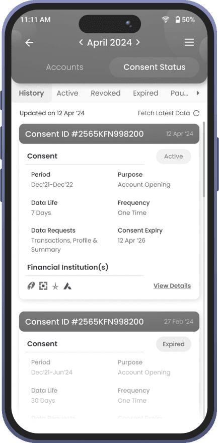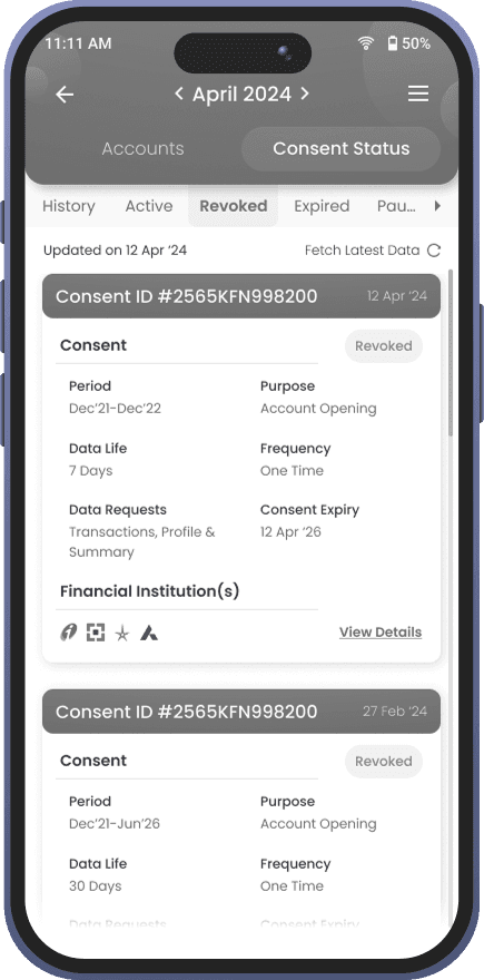 A granular history view that maps every Consent ID to its specific parameters and financial institutions, providing a full audit trail for total data transparency.