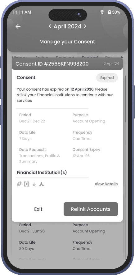 A dedicated list for consents past their tenure, empowering users to either maintain a record of expired access or seamlessly relink accounts for a new period.