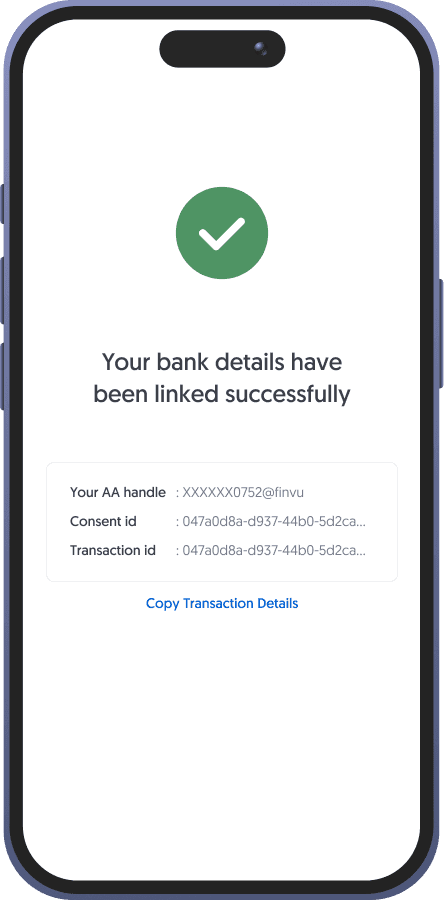 Providing users with unique identifiers (AA Handle, Transaction ID, Consent ID) to ensure a transparent and auditable record of the data handshake before returning to the FIU flow.