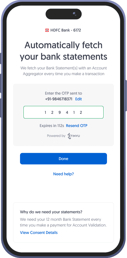 Utilizing masked identifiers and OTP-based verification to ensure the user is securely linked to the correct financial profile.