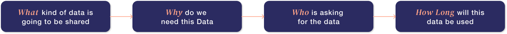 I translated technical data-sharing parameters into four human-centric pillars to ensure transparency: What data is shared, Why it is needed, Who is asking, and How Long it will be used.