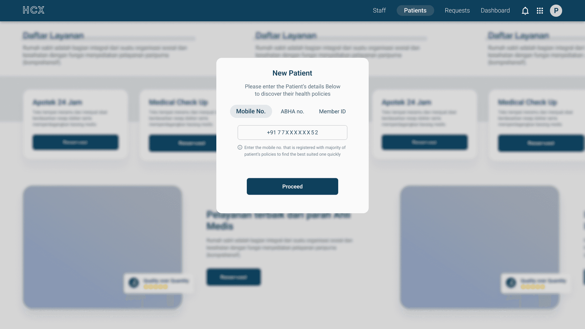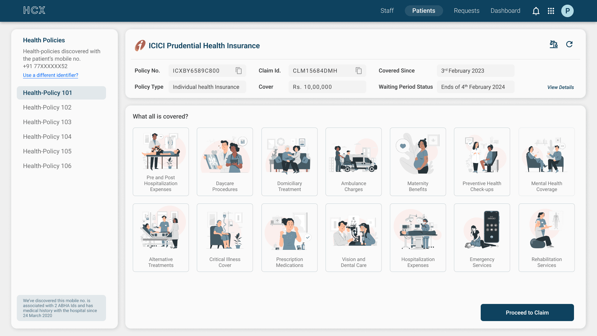 Instead of filling out physical forms, the hospital staff enters the patient’s mobile number. The system acts as a "Discovery Layer," fetching all insurance policies linked to that number.