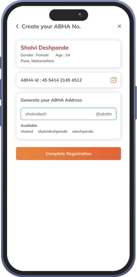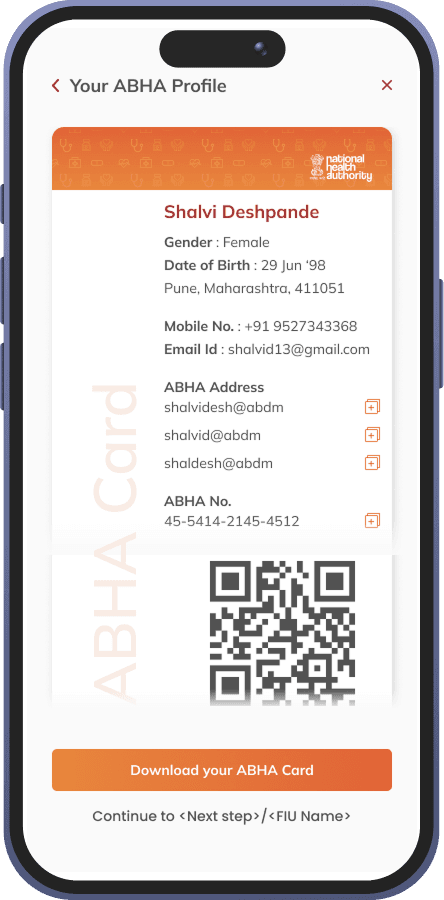 Upon successful registration, the user receives their ABHA Card, featuring a QR code for instant hospital check-ins and a unique ABHA address (e.g., shalvidesh@abdm).
