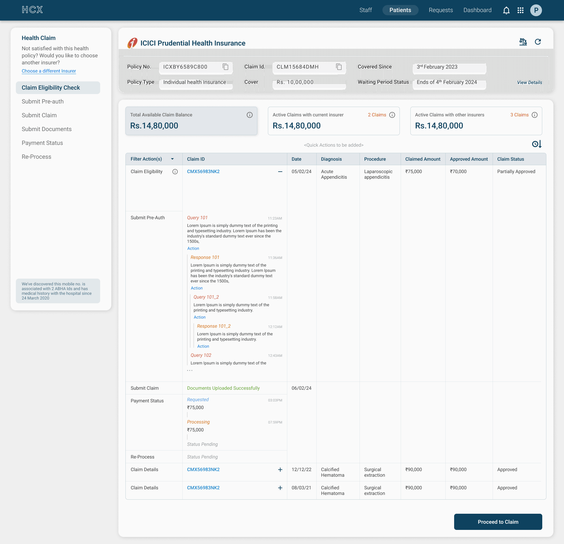 Financial Visibility: Staff can view policy types, coverage amounts (e.g., Rs. 10,00,000), and waiting periods without digging through fine-print documents.
